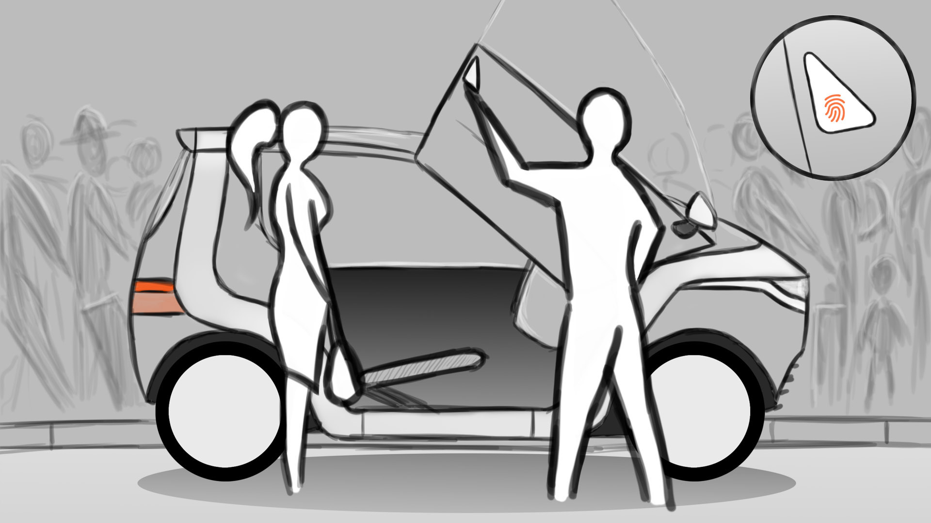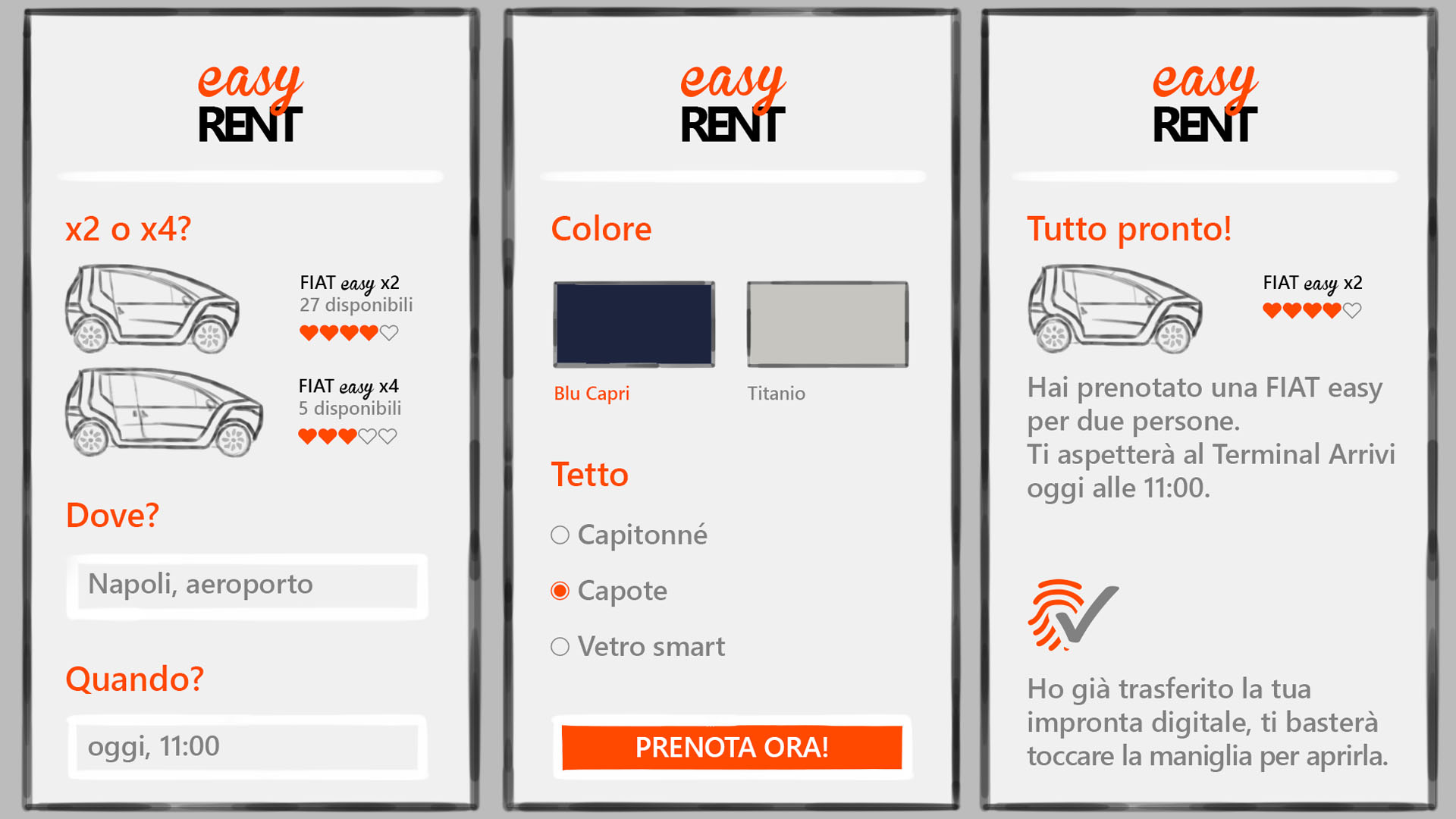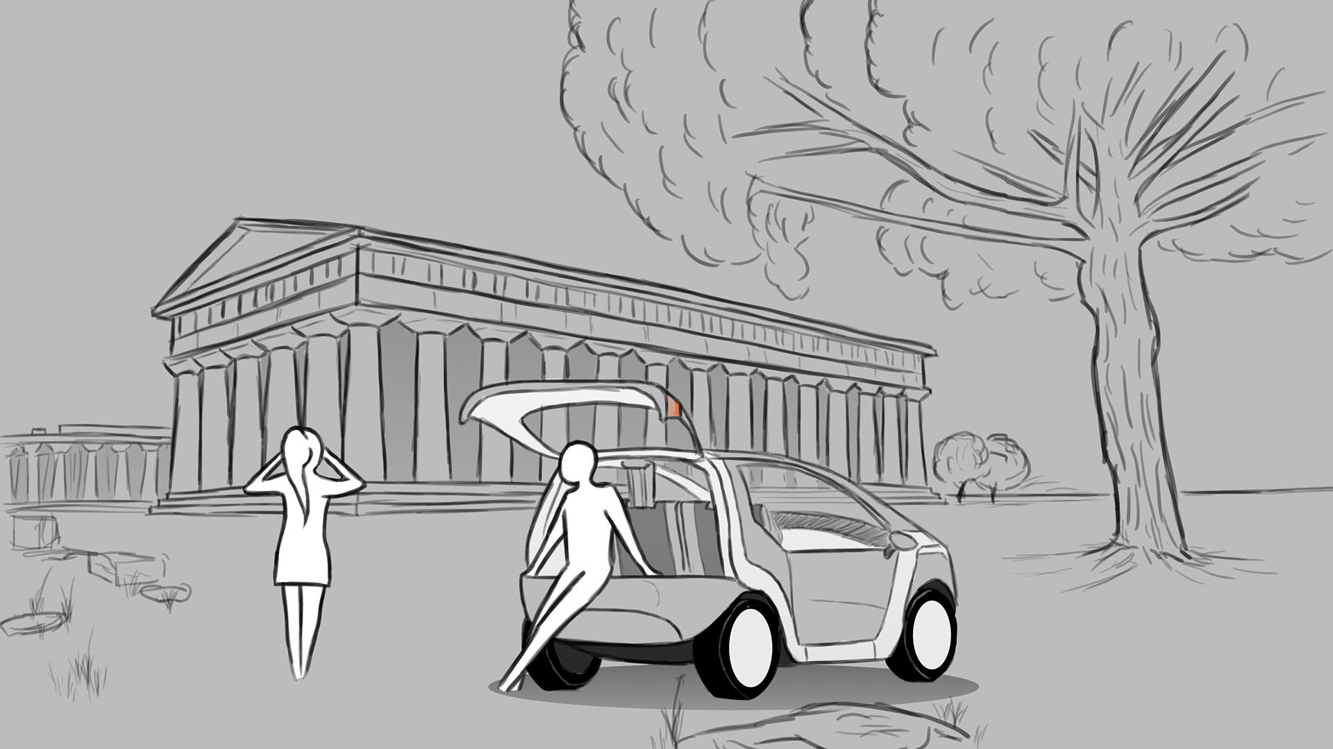 Dopo un intenso periodo di lavoro si sogna una breve pausa per ritrovare il proprio equilibrio. Una meta può essere la Costiera Amalfitana, un sito Unesco che coniuga natura e cultura. Si decide e si parte in aereo, destinazione Napoli. Prima di decollare, lei ricorda a lui di prenotare l’auto; lui, in un paio di minuti, grazie all’app dedicata, prenota una FIAT easy tre-porte. La vettura, dotata di guida autonoma, aspetterà la coppia all’uscita del terminal degli arrivi. L’apertura della portiera avviene previa scansione dell’impronta digitale, trasferita dallo smartphone alla vettura in fase di prenotazione. Appena entrati nella FIAT easy, gli ampi monitor multi-touch del cruscotto suggeriscono l’hotel dove pernottare e i ristoranti per la serata, con tanto di recensioni di altri utenti e possibilità di prenotare direttamente dalla vettura. Il giorno seguente c’è lui alla guida, mentre lei prende informazioni sull’escursione che li attrae, Paestum, tramite il display della FIAT easy. Qualche foto ai templi millenari, una visita al museo, un brunch con mozzarella di bufala, un po’ di aria di mare e si riparte, ma al ritorno guida il pilota automatico di FIAT easy, concedendo un po’ di relax anche a lui. Alla sera, prima di rientrare in albergo, con i sedili totalmente abbassati ci si può abbandonare all’immensità del cielo stellato attraverso il tetto trasparente.