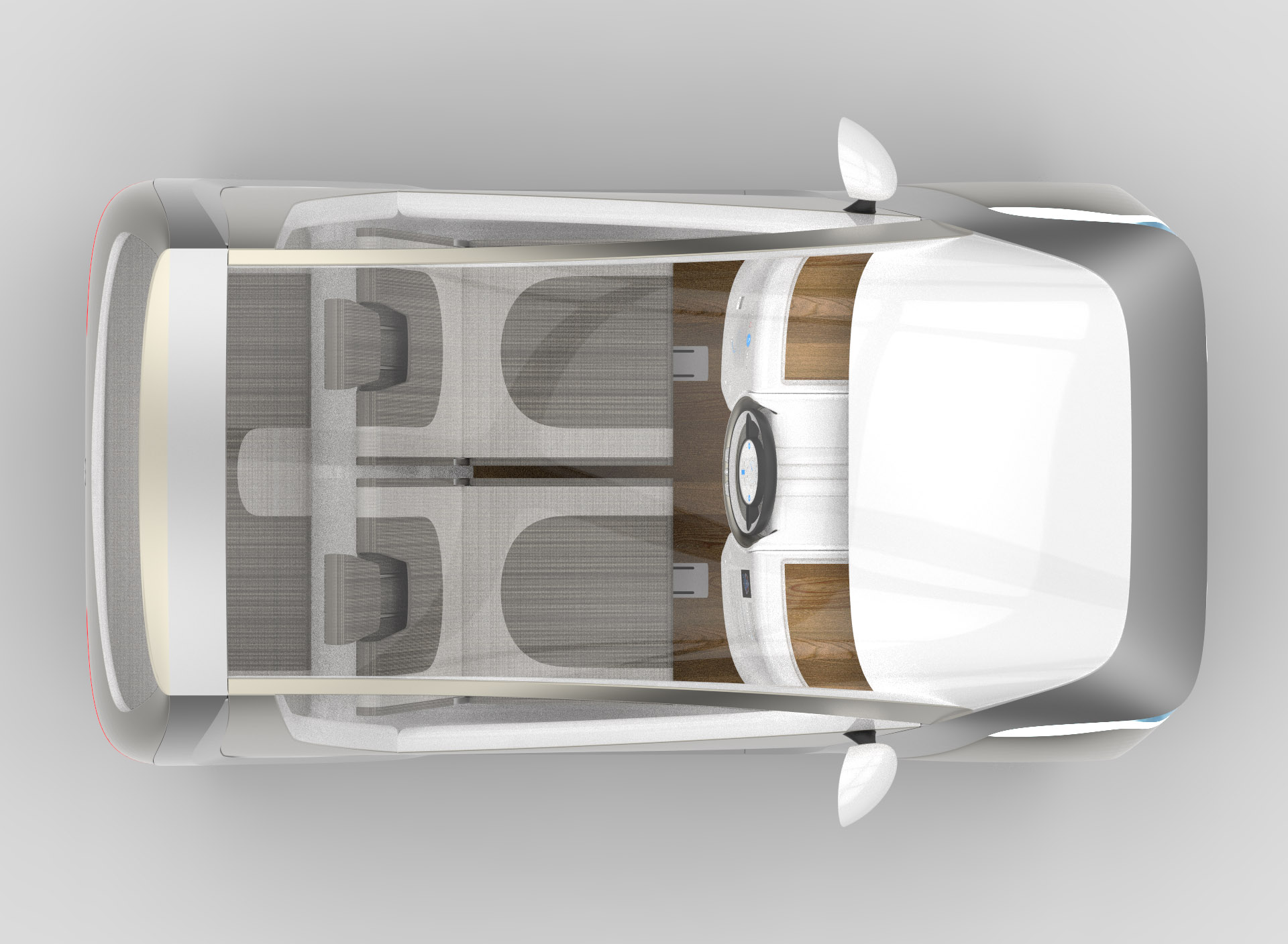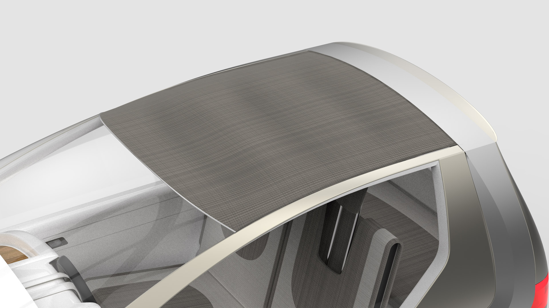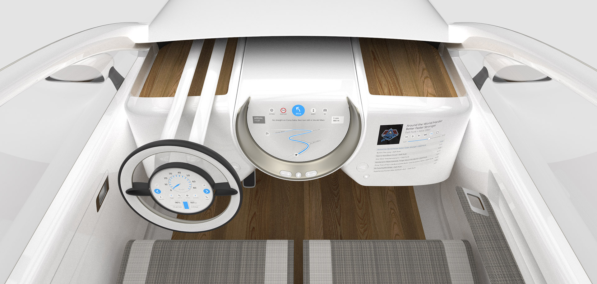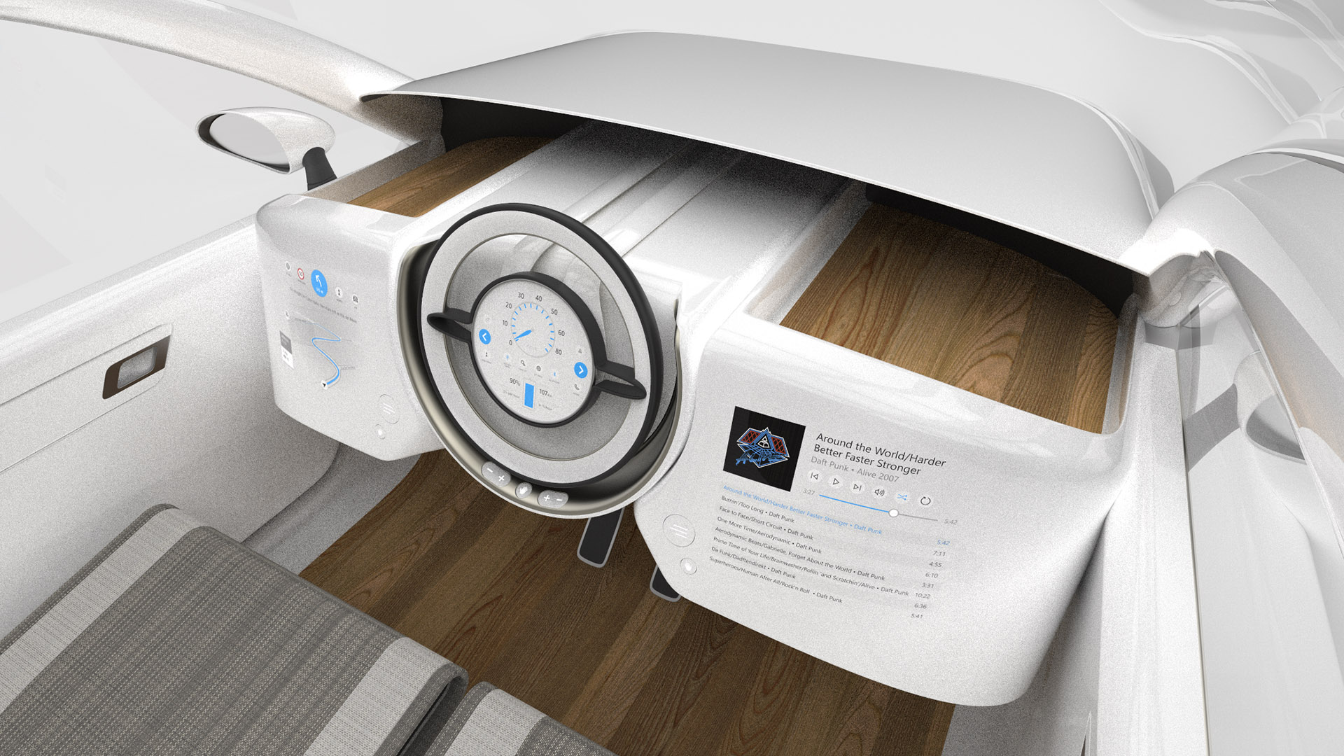 Nella parte superiore, i due moduli laterali hanno ciascuno un capiente vano portaoggetti, dove poter stipare una borsa, lo smartphone, il tablet o qualsiasi altro accessorio da tenere sempre a portata di mano. Tale spazio è sempre accessibile, a prescindere dalla posizione dei moduli. Le facce rivolte verso i passeggeri integrano un display a colori multi-touch curvo derivato dagli e-book reader. In base alle scelte dei passeggeri, i due ampi schermi possono mostrare comandi di guida supplementari, indicazioni stradali, turistiche o funzioni multimediali e di intrattenimento, a seconda dello scenario di utilizzo della vettura.