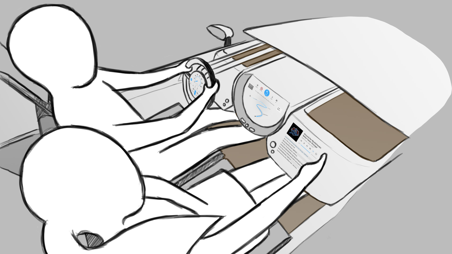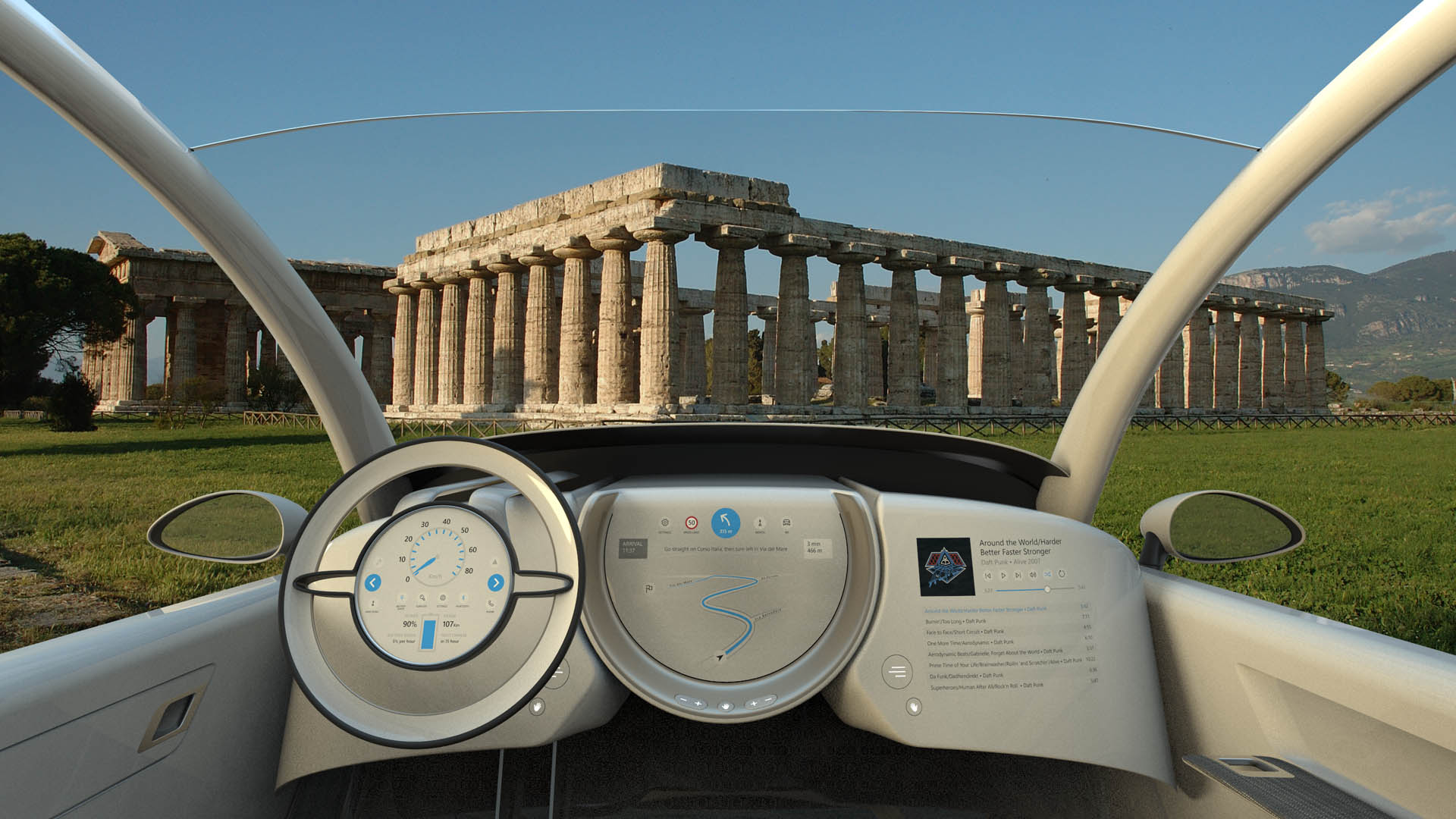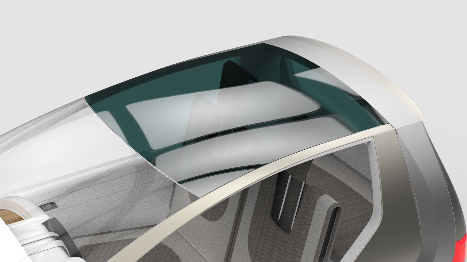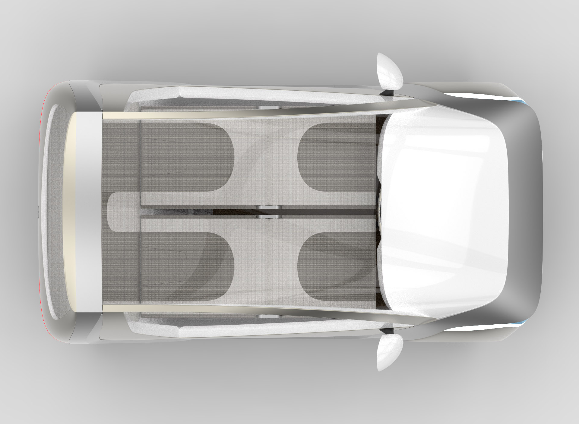 Nella parte superiore, i due moduli laterali hanno ciascuno un capiente vano portaoggetti, dove poter stipare una borsa, lo smartphone, il tablet o qualsiasi altro accessorio da tenere sempre a portata di mano. Tale spazio è sempre accessibile, a prescindere dalla posizione dei moduli. Le facce rivolte verso i passeggeri integrano un display a colori multi-touch curvo derivato dagli e-book reader. In base alle scelte dei passeggeri, i due ampi schermi possono mostrare comandi di guida supplementari, indicazioni stradali, turistiche o funzioni multimediali e di intrattenimento, a seconda dello scenario di utilizzo della vettura.