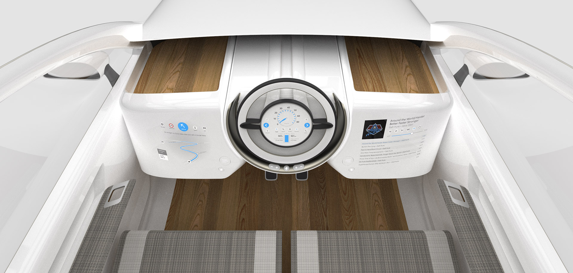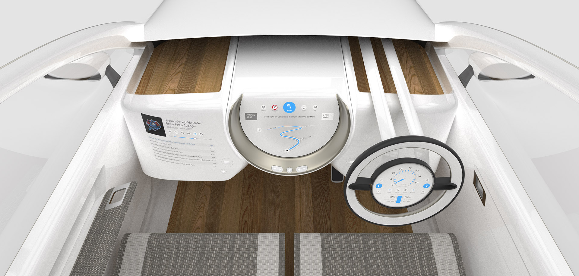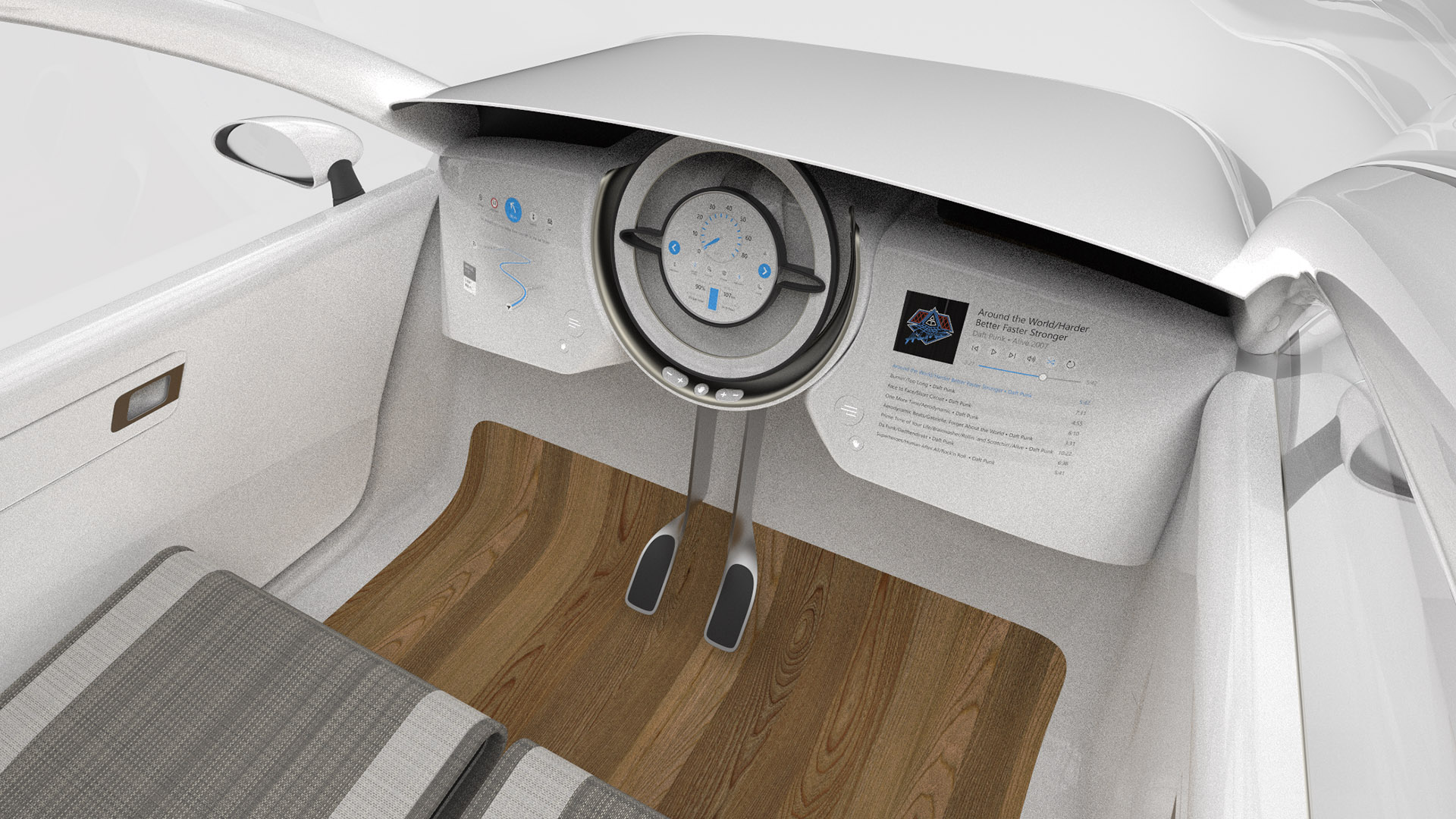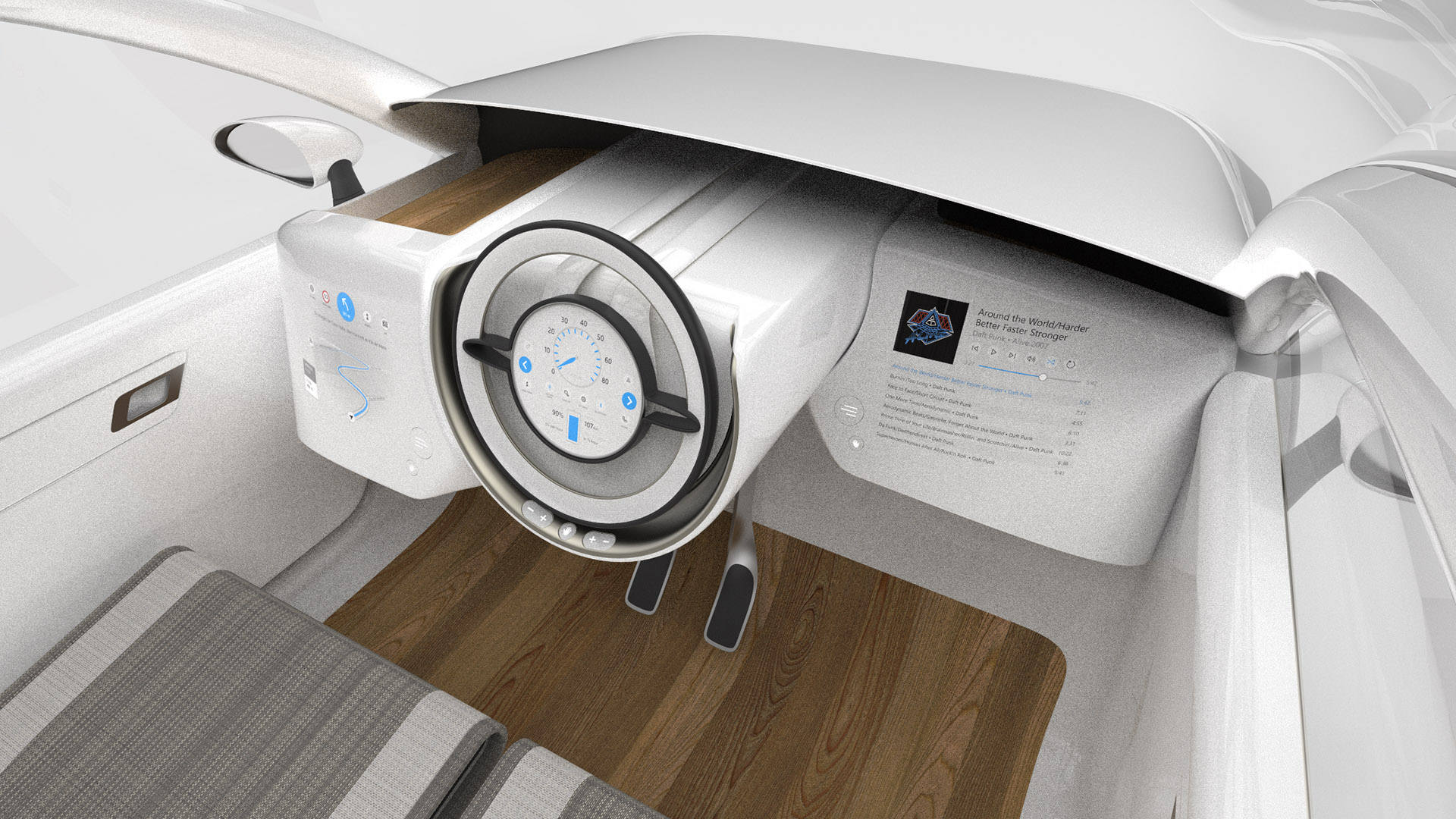 Il volante, sempre in un’ottica di massima libertà di configurazione dell’abitacolo, grazie a due solidi binari perpendicolari tra di loro e nascosti sotto la parte statica del cruscotto, può traslare dal modulo centrale verso il passeggero di sinistra, ma anche verso quello di destra, con una conseguente riconfigurazione automatica dei comandi sulle quattro dashboard: infatti, oltre ai due display dei moduli laterali, un terzo e un quarto sono ospitati nel modulo centrale e al centro del volante.