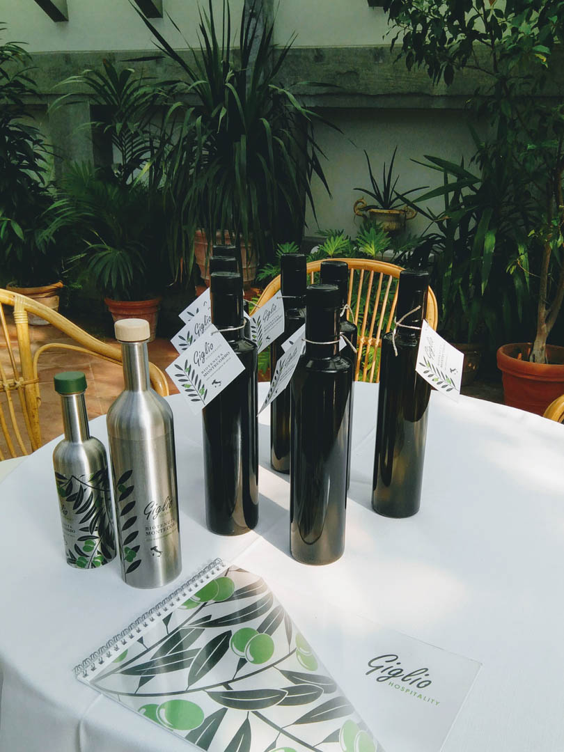 Design delle etichette serigrafate per l’olio extravergine d’oliva Giglio Travel, Biotenuta Montecorbo.