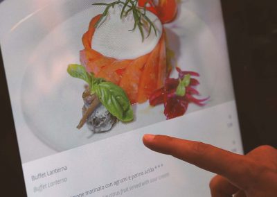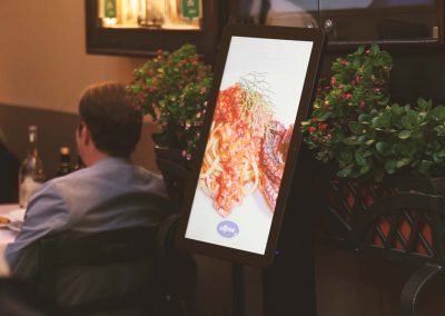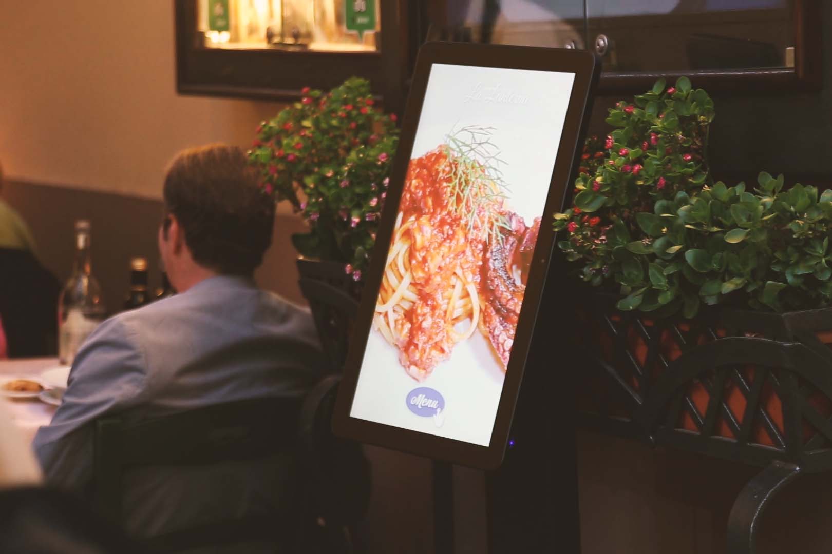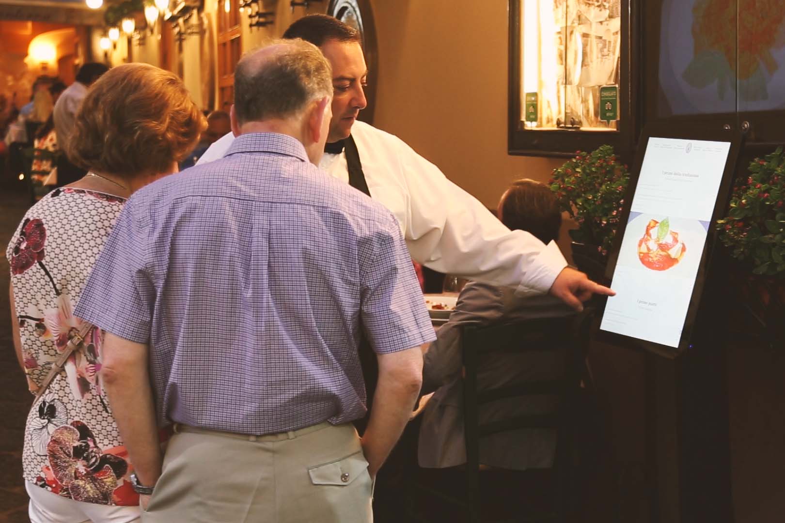 Il menu interattivo multilingua RistoPixel consiste in un grande display multitouch Full HD (22 pollici o superiore), con cavalletto in alluminio. Il software si aggiorna in automatico (via cloud). La grafica è personalizzabile ed esclusiva, e può essere coordinata a quella del ristorante, includendo il logo e basandosi sui colori e sul layout preferiti.